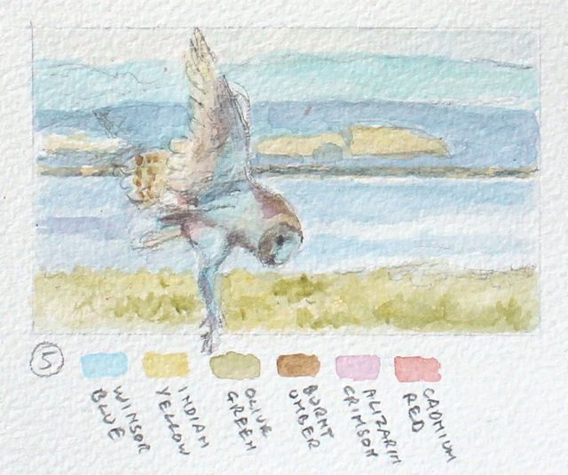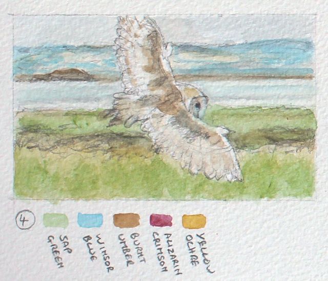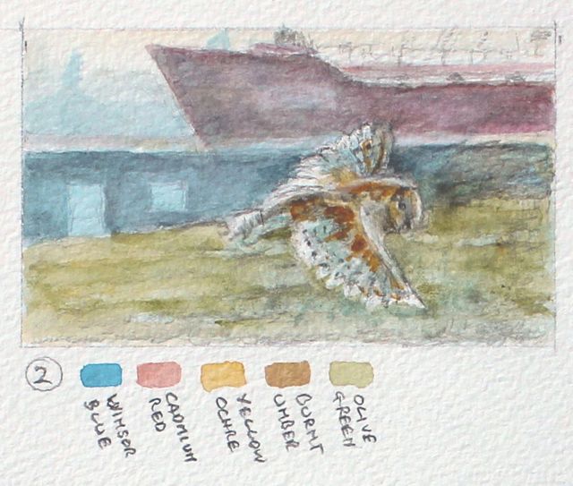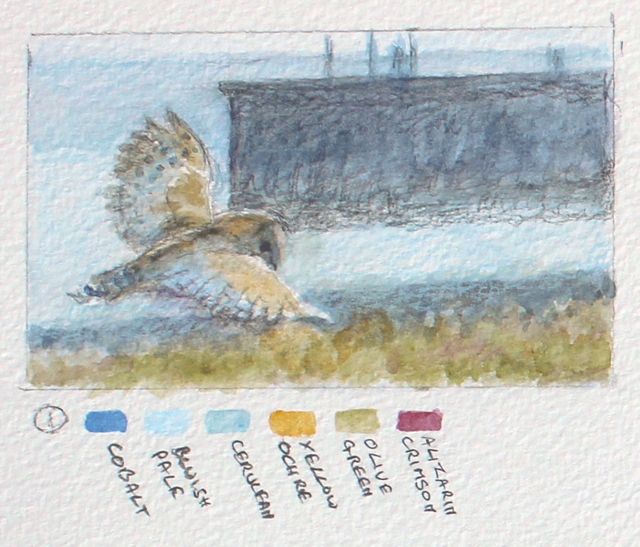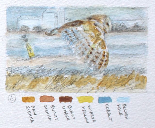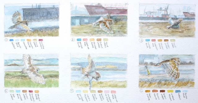 These watercolour sketches recall the owl as it worked its way from one end of Portbury marsh to the other – a beautiful sight on a beautiful June morning.