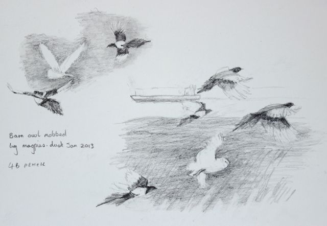 Last but not least a pencil sketch of a barn owl mobbed by magpies as seen on a dusk visit in January.