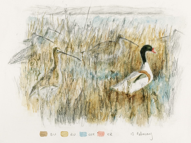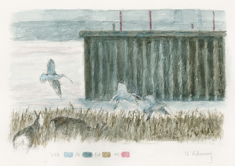 It is a cool, muted morning. Up against the stark dock wall there are curlews. I watch a while and a pair of winter roe deer amble into view. With heads down they are hard to see.