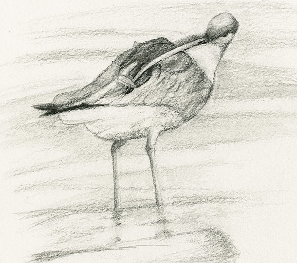 The iconic curlew with a beak long enough to find a worm deep in the mud and long enough to reach that feather.