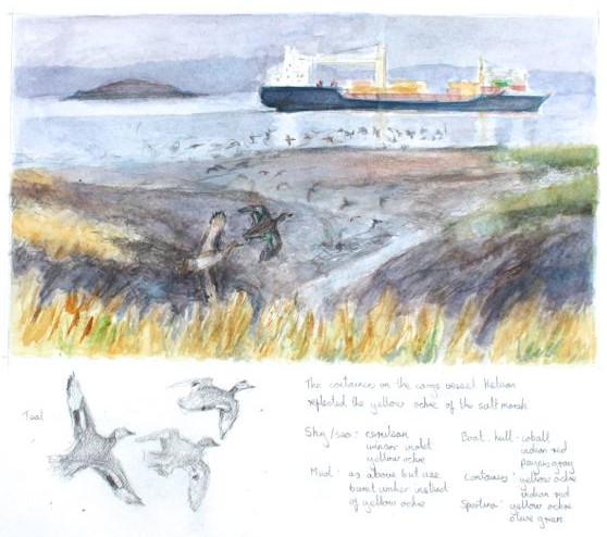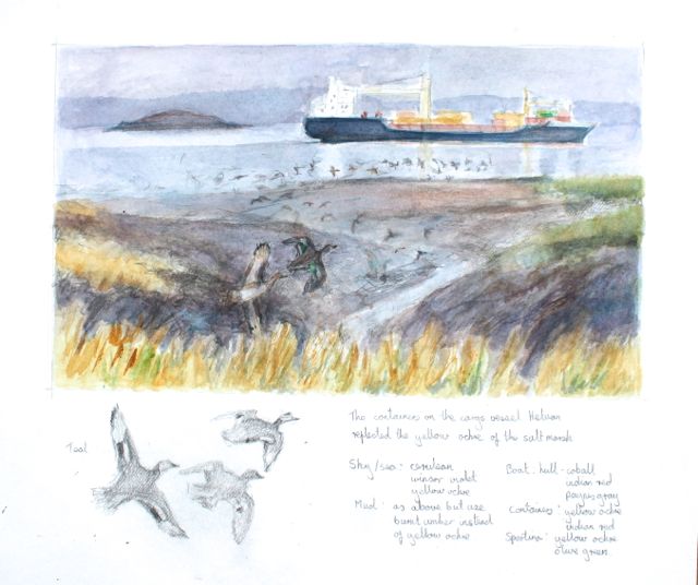 I remember watching the cargo vessel Heluan passing Chapel Pill. The colours of her containers matched the September hues of the salt marsh grass. The teal zigzagged their way down the pill following the water course.