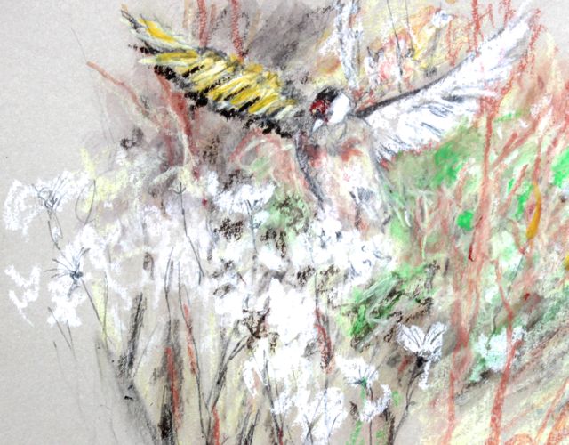 Here goldfinches plunder the seed heads at the edge of the marsh in sight of the redshank on the mudflats.