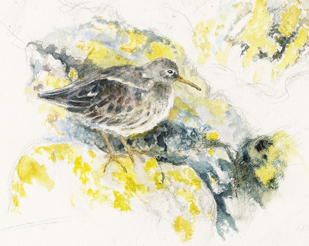 Gosh it’s cold out there! The freezing northerly wind chills me to the bone, but what a sight as the sun catches on yellow lichen and purple sandpipers.